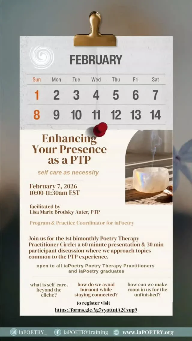 iaPOETRY is a credentialling organization training Poetry Therapy Practitioners (PTP) and Mentors.